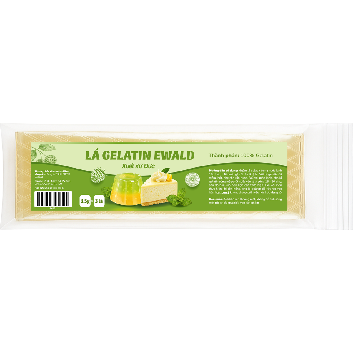 • Lá gelatin Ewald là sản phẩm cao cấp đến từ Đức – nổi tiếng với chất lượng ổn định, khả năng đông kết tốt và không mùi lạ